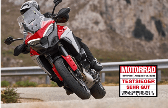 | Straße, Offroad oder Enduro? Die Fans von Reiseenduros der „GS-Klasse“ können für ihr Bike – je nach Streckenvorliebe – aus verschiedenen Reifenklassen wählen. Nach dem großen Vergleichstest von „Motorrad“ (Ausgabe 06/2025) für die beste Bereifung in den „GS-Dimensionen“ – 120/70 R 19 vorne und 170/60 R 17 hinten – fällt die Wahl nicht schwer, denn den Gesamtsieg und das Testurteil „sehr gut“ holte sich der Pirelli SCORPION™ TRAIL III. |